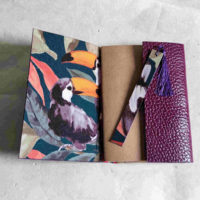 Une couverture en cuir de maroquinerie et doublée de papier décoré que j’ai créé.