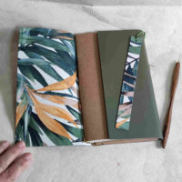 Une couverture en cuir de maroquinerie et doublée de papier décoré que j’ai créé.