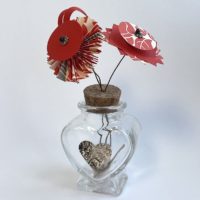 Flacon en verre de 6 x 5 cm avec son capuchon orné d’une composition de 3 fleurs en papier fabriquées artisanalement dans mon atelier.