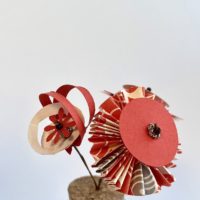 les fleurs sont fabriquées à partir de chutes de papier rouge corail /blanc et de perles.